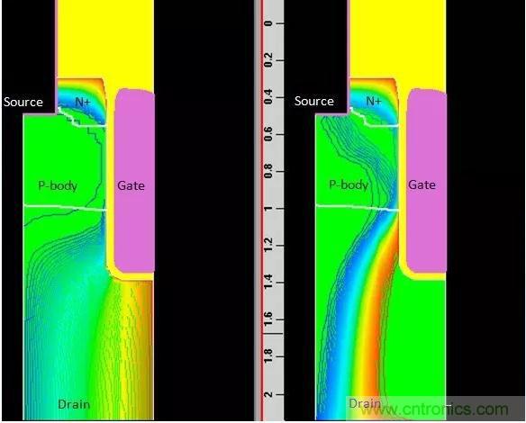 從電勢(shì)分布圖,功率MOSFET完全導(dǎo)通時(shí),VDS的壓降低,耗盡層完全消失;功率MOSFET在線性區(qū)工作時(shí),VDS的電壓比較高,耗盡層仍然存在,此時(shí)由于在EPI耗盡層產(chǎn)生電子-空穴對(duì),空穴也會(huì)產(chǎn)生電流,參入電流的導(dǎo)通。