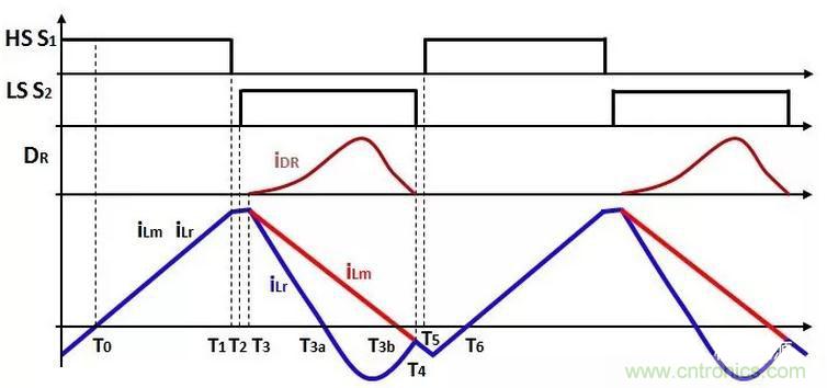 在這個階段,Lr和Cr串聯諧振,iLr過0后,反向繼續諧振;然后,經過一段時間, iLm也過0,反向激磁繼續增加。