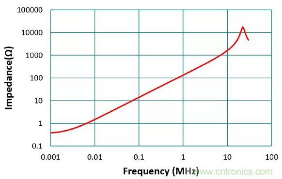 如圖4,從阻抗圖也可以看出電感在不同頻率下的表現。電感的阻抗約與頻率成正比(Z=2πfL),因此頻率愈高,電抗會比交流電阻大很多,所以阻抗表現就如同純電感(相位為90?)。而再往高頻,由于寄生電容效應,可以看到阻抗的自我諧振頻率點,過了此點阻抗下降呈現電容性,且相位逐漸轉為-90 ?。