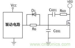 功率MOSFET的跨導大,開通過程中,VGS較小的變化都會導致ID急劇的變化,進而導致VDS急劇的變化,瞬態過程中柵極電壓容易產生振蕩。串聯電阻RGD可以抑制回路的瞬態高頻電流,形成阻尼振蕩從而抑止柵極的高頻振蕩,減小振蕩的幅度。