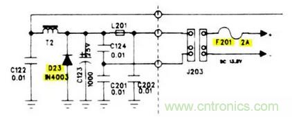 收音機的設計中電源部分有一個二極管,其功能是提供反向保護。基本上,如果你把收音機電源極性接錯了,二極管就會導通(D23),并且熔斷電源線上2安培的保險絲(F201)。這是一個非常典型的電源供電電路。
