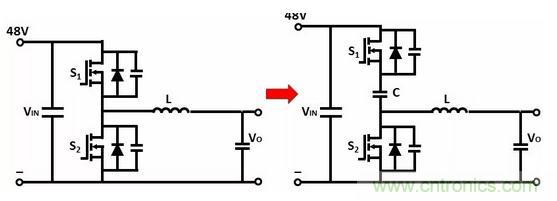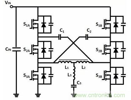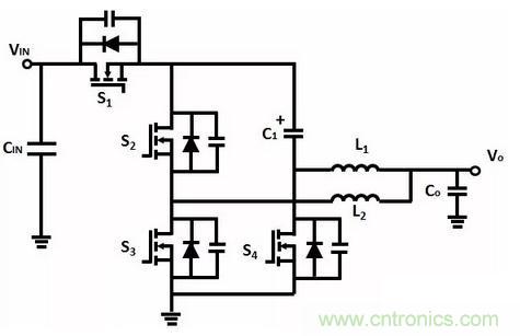 如果C1、C2的電容相等,電感電流等于電容C1、C2的電流之和。S1、S3工作于硬開關狀態,由于S1、S3的電流降低,因此可以同時降低導通損耗和開關損耗。