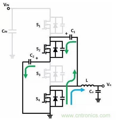 輸出電感去磁,在前面一個階段過程結束時,由于C1、C2的電壓不平衡,當S2、S4導通后,將C1、C2并聯,所以電壓高的電容將會對電壓低的電容放電,那么,S4不僅流過輸出電感續流電流,還要流過C1、C2充放電的電流,因此其導通損耗會增加。