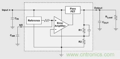 圖1:LDO中的傳輸元件為P型MOSFET,其可以在接近飽和狀態下工作。這與傳統線性穩壓器相比,是通過降低VDROPOUT來提高效率。(圖片來源:Texas Instruments)