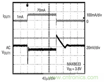 圖3:對輸出負載快速變化的瞬態電壓響應是無線傳感器應用的LDO關鍵性能指標。此處所示為高性能LDO的響應。(圖片來源:Maxim Integrated)