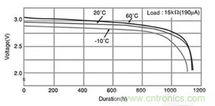 圖5:在190μA的典型無線傳感器平均電流負載和20°C的工作溫度下,CR2032電池可維持>2.7V電壓1000 小時。(圖片來源:Panasonic)