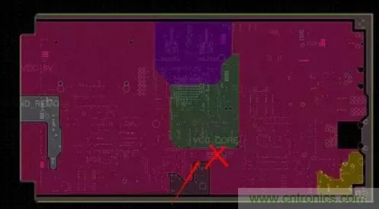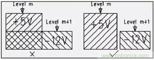 如若在相鄰平面處理電源,要盡量避免銅皮或者走線平行處理。主要是為了減少不同電源之間的干擾,特別是一些電壓相差很大的電源之間,電源平面的重疊問題一定要設(shè)法避免,難以避免時可考慮中間隔地層。