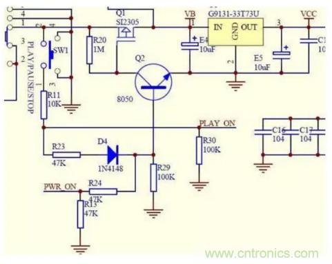 圖中電池的正電通過開關S1接到場效應管Q1的2腳源極,由于Q1是一個P溝道管,它的1腳柵極通過R20電阻提供一個正電位電壓,所以不能通電,電壓不能繼續(xù)通過,3v穩(wěn)壓IC輸入腳得不到電壓所以就不能工作不開機!這時,如果我們按下SW1開機按鍵時,正電通過按鍵、R11、R23、D4加到三極管Q2的基極,三極管Q2的基極得到一個正電位,三極管導通(前面講到三極管的時候已經(jīng)講過),由于三極管的發(fā)射極直接接地,三極管Q2導通就相當于Q1的柵極直接接地,加在它上面的通過R20電阻的電壓就直接入了地,Q1的柵極就從高電位變?yōu)榈碗娢唬琎1導通電就從Q1同過加到3v穩(wěn)壓IC的輸入腳,3v穩(wěn)壓IC就是那個U1輸出3v的工作電壓vcc供給主控,主控通過復位清0,讀取固件程序檢測等一系列動作,輸處一個控制電壓到PWR_ON再通過R24、R13分壓送到Q2的基極,保持Q2一直處于導通狀態(tài),即使你松開開機鍵斷開Q1的基極電壓,這時候有主控送來的控制電壓保持著,Q2也就一直能夠處于導通狀態(tài),Q1就能源源不斷的給3v穩(wěn)壓IC提供工作電壓!SW1還同時通過R11、R30兩個電阻的分壓,給主控PLAY ON腳送去時間長短、次數(shù)不同的控制信號,主控通過固件鑒別是播放、暫停、開機、關機而輸出不同的結(jié)果給相應的控制點,以達到不同的工作狀態(tài)!