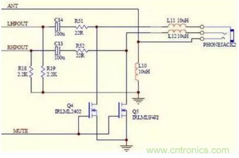 上圖是一個有主控控制耳機有沒有聲音輸出的電路圖,聲音的左右聲道分別通過隔直流電容C13、C14和電阻R51、R52送到耳機孔,但是在電阻R51、R52和耳機孔之間卻接入了一個N溝道的mos場效應管,這個場效應管的柵極連接在一起受著MUTE的控制,當MUTE的地方處于高電位時候,Q4、Q5導通,就會把聲音通過Q4、Q5入地,耳機里就不會有聲音了,當MUTE的地方處于低電位時候,Q4、Q5關斷,聲音就只有通過耳機而發(fā)出聲音了!