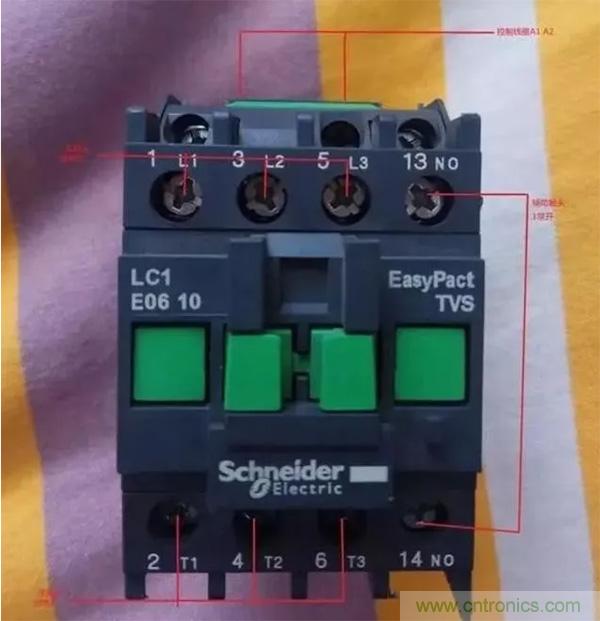 如上圖所示,接觸器共有六個(gè)主觸點(diǎn),1,3,5為主觸點(diǎn)進(jìn)線孔,2,4,6為主觸點(diǎn)出線孔,A1,A2為接觸器線圈的兩個(gè)接線端子,在接觸器的主觸點(diǎn)的稍下方。也有的接觸器A2有兩個(gè)接點(diǎn),我們?cè)谶\(yùn)用的時(shí)候隨便接哪一個(gè)都行。線圈接線不分零火。