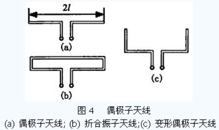 在遠(yuǎn)距離耦合的RFID 應(yīng)用系統(tǒng)中,最常用的是偶極子天線(又稱對(duì)稱振子天線) . 偶極子天線及其演化形式如圖4 所示,其中偶極子天線由兩段同樣粗細(xì)和等長(zhǎng)的直導(dǎo)線排成一條直線構(gòu)成,信號(hào)從中間的兩個(gè)端點(diǎn)饋入,在偶極子的兩臂上將產(chǎn)生一定的電流分布,這種電流分布就在天線周圍空間激發(fā)起電磁場(chǎng).利用麥克斯韋方程就可以求出其輻射場(chǎng)方程:
