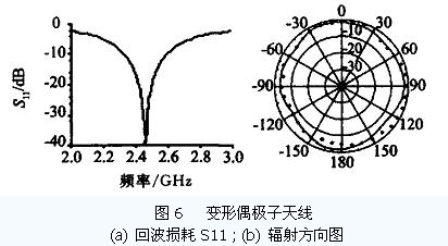 從圖5b 可以看到在天線軸方向上,天線幾乎無輻射. 如果此時(shí)讀寫器處于該方向上,應(yīng)答器將不會(huì)做出任何反應(yīng). 為了獲得全方位輻射的天線以克服該缺點(diǎn),可以對(duì)天線做適當(dāng)?shù)淖冃?如在將偶極子天線臂末端垂直方向上延長(zhǎng)λ/ 4 成圖4c 所示. 這樣天線總長(zhǎng)度修改為(57. 0 mm + 2 ×28. 5 mm) ,天線臂寬仍然為1 mm. 天線臂延長(zhǎng)λ/ 4 后,整個(gè)天線諧振于1 個(gè)波長(zhǎng),而非原來的半個(gè)波長(zhǎng). 這就使得天線的輸入阻抗大大地增加,仿真計(jì)算結(jié)果約為2 kΩ. 其輸入回波損耗S11如圖6a 所示. 圖6b 為E 面(天線平面) 上的輻射場(chǎng)方向圖,其中實(shí)線為仿真結(jié)果,黑點(diǎn)為實(shí)際樣品測(cè)量數(shù)據(jù),兩者結(jié)果較為吻合說明了該設(shè)計(jì)是正確的. 從圖6b 可以看到在原來弱輻射的方向上得到了很大的改善,其輻射已經(jīng)近似為全方向的了. 電壓駐波比(VSWR) 小于2. 0 時(shí)的阻抗帶寬為12.2 % ,增益為1.4 ,對(duì)于大部分RFID 應(yīng)用系統(tǒng),該偶極子天線可以滿足要求.