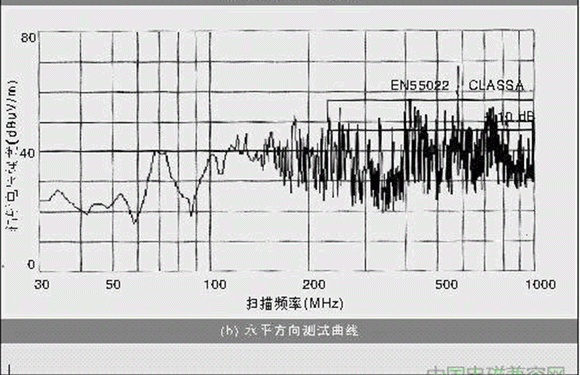 測試環境為電波暗室,測試設備為寬帶天線、頻譜分析儀和信號放大器,天線可以在1 m與4 m高度范圍內升降,被測產品放置在一個可360°旋轉的平臺上,距離天線3 m。測量時轉動平臺,升降天線找到最大干擾,天線測量取水平和垂直兩種極化。