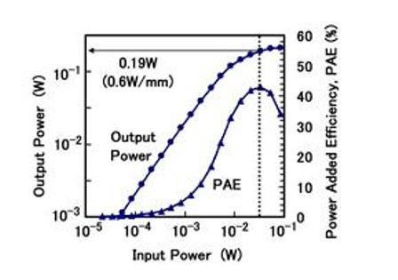 富士通通過使用45nm工藝技術(shù)把新型晶體管技術(shù)應(yīng)用到3.3 V I/O的標(biāo)準(zhǔn)晶體管上,從而開發(fā)出了世界上首個(gè)能把擊穿電壓從6 V 提高到 10 V的晶體管。新型晶體管適用于功率放大器,它在最大振蕩頻率為43 GHz (圖2)時(shí)每個(gè)1mm門極寬度能夠輸出0.6 W(0.6 W/mm),展示了其作為功率放大器在面向WiMAX等高頻應(yīng)用方面的卓越性能。新型晶體管在基本的可靠性測(cè)試上也取得了良好的測(cè)試結(jié)果。