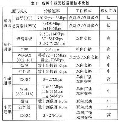 表1列出了四種模式下各種車載無線通訊技術的比較。