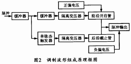 本調(diào)制器的組成原理框圖如圖2所示。圖中,當(dāng)定時(shí)脈沖輸入到來時(shí),經(jīng)過緩沖器驅(qū)動(dòng)后,該脈沖將分成兩路,分別提供給調(diào)制脈沖前沿開啟和后沿截止MOS管。其中前沿開啟脈沖經(jīng)緩沖器驅(qū)動(dòng)和三極管放大后,加到隔離升壓變壓器,以保證高速開啟管正常開啟;而后沿截止脈沖則使用后沿觸發(fā)的單穩(wěn)態(tài)觸發(fā)電路形成,以保證形成的調(diào)制脈沖的寬度與定時(shí)脈沖的寬度一致。