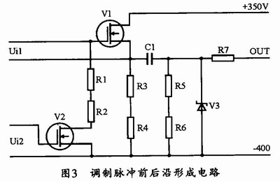 本調(diào)制器的調(diào)制脈沖前后沿形成使用的是BUZ50B,當(dāng)Ui2使得V2導(dǎo)通時(shí),負(fù)偏電壓將使V1迅速截止。這樣形成的調(diào)制脈沖就能夠具有非常良好的后沿波形。其電路圖如圖3所示。