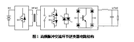 高頻脈沖交流環節逆變器,如圖1所示。該電路結構由高頻逆變器(推挽式、半橋式、全橋式)、高頻變壓器、周波變換器(全波式、橋式)構成,具有電路拓撲簡潔、雙向功率流、兩級功率變換(DC/HFAC/LFAC)、變換效率高等優點。