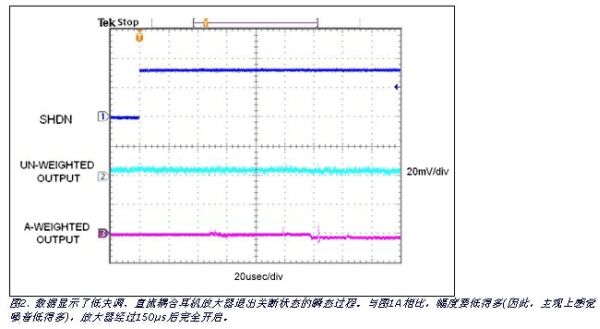 第二種瞬變過程,即直流耦合耳機放大器(圖2),似乎淹沒在A加權濾波之前示波器的噪聲底中。對于這種放大器,大部分音頻來自從關斷到完全工作時產生的直流失調電壓。由于失調只有幾個毫伏,沒有經過濾波的信號不能精確決定咔嗒聲的大小。采用A加權濾波后,從噪聲基底中提取出直流耦合耳機放大器失調產生的咔嗒聲,獲得更客觀的測量結果。 (注意,沒有顯示濾波后的信號標度V/div。)