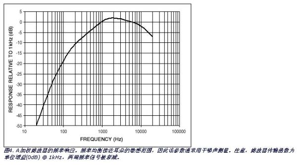 下一步,選擇分析儀的A加權濾波(建議)或非加權22Hz至22kHz濾波器,將測量帶寬限制在音頻范圍內。請注意,示波器的快速高電平瞬變并不表明有多少能量出現在音頻頻帶內。人耳對揚聲器或耳機瞬變信號的頻率響應很有限。因此,增加A加權濾波(圖4)更有利于分析,因為這樣增強了人耳敏感的頻率分量。某些音頻分析儀不能選用A加權,這種情況下,應限制人耳頻率響應的帶寬。音頻測試設備中常用的限制帶寬是22Hz至22kHz,帶寬限制濾波器大概能達到20kHz的平坦響應(通常為人耳的上限)。