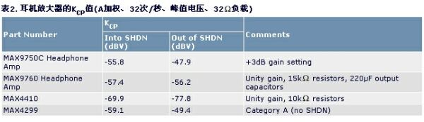 在很多應用中,盡管許多因素會影響可接受咔嗒聲電平的建立,我們還是可以規定一個可信的指標基準。注意,Maxim耳機放大器B類咔嗒聲的測試結果(表2),所有測試均采用一個32負載電阻,每一KCP值代表每個端口四次采樣的平均值。