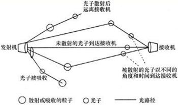 對天氣非常敏感是FSO的另一個主要問題。晴天對FSO傳輸質量的影響最小,而雨、雪和霧的影響較大。據測試,FSO 受天氣影響的衰減經驗值分別為:晴天,5~15dB/km;雨天,20~50dB/km;雪天,50-150dB/km;霧天,50~300dB/km??梢娪绊懽畲蟮氖庆F天,這是因為霧中的散射粒子的半徑與激光的波長在同一數量級上,而且散射粒子非常集中,從而使光線的傳播方向發生偏轉,造成空間、角度和時間上的擴展,如圖2。對于這種大氣現象處理的方式,與微波通信中對待雨衰相似。要在系統傳輸的計算中,為光信號的衰減留有足夠的系統功率余量,以便在出現濃霧最大衰減的情況下,仍能接收到所需的光信號功率。重要的是,要獲得所在地長期的氣象統計資料,能夠知道不同等級(能見度)的霧,即不同衰減的大氣介質出現的統計規律。如果了解到衰減值大于某一指標出現的概率,就能確定光無線系統為了保證可用性的指標(比如99.9%),需要容納多大的大氣損耗。而傳輸距離的計算公式如式(1)所示。