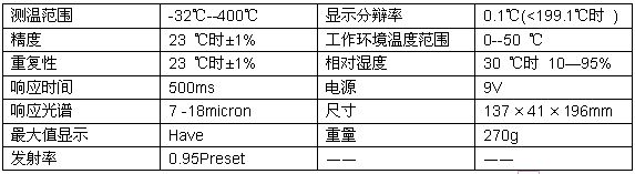 紅外測溫儀是通過接收目標物體發射、反射和傳導的能量來測量其表面溫度。測溫儀內的探測元件將采集的能量信息輸送到微處理器中進行處理,然后轉換成溫度讀數顯示。在帶激光瞄準器的型號中,激光瞄準器只做瞄準使用。其性能說明下表。