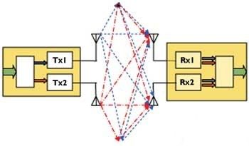 通過使用多路傳輸方式,在每個接收天線上采用空間微分技術,使得DSP能夠進行信號分離并恢復原始的兩路數據流。使用相同射頻信道的獨立發射器,在它們各自的天線上發送出獨立的數據,然后,接收天線匯集所有發射器的復合信號。通過巧妙設計的MIMO報文和先進的DSP,就可以恢復出獨立的數據流。數據速率與發射器和天線數量之間具有幾乎線性的關系,速率的提高并不需要增大信道帶寬。