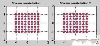 圖2 Tx1和Tx2的64 QAM數據流信號的群視圖,這是一種理想情況,其中調制信號是沒有失真的