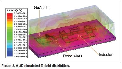 第二個關注的地方是微帶線附近的場線,在靠近地平面的地方它們最強。只要屏蔽和地平面間的距離明顯大于微帶線和地平面間的距離,則增加的屏蔽的效用就微乎其微。線綁定和表貼電感與地平面的直接耦合要弱些,當施加屏蔽時,預期其場線會有變化。圖3顯示的是3D模擬的E場分布。