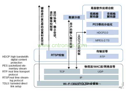 Wi-Fi Display是以無需經(jīng)由WLAN接入點即可在終端間直接通信的標(biāo)準(zhǔn)“Wi-Fi Direct”為基礎(chǔ),由上層的協(xié)議棧軟件構(gòu)成的安裝指南。鎖定終端服務(wù)的“服務(wù)發(fā)現(xiàn)(Service Discovery)”等的處理利用Wi-Fi Direct進(jìn)行,影像的壓縮/解壓處理及管理數(shù)據(jù)流的傳輸層等利用Wi-Fi Display處理(圖2)。壓縮/解壓采用H.264格式。由于最近的智能手機(jī)不但標(biāo)配WLAN功能,采用內(nèi)置H.264編解碼器電路GPU的終端也很多,因此Wi-Fi Display還具有易于配備到終端中的特點。“在受限于安裝面積和耗電量的智能手機(jī)中,無需追加硬件即可配備的優(yōu)勢非常大”(Cavium公司的柴田)。