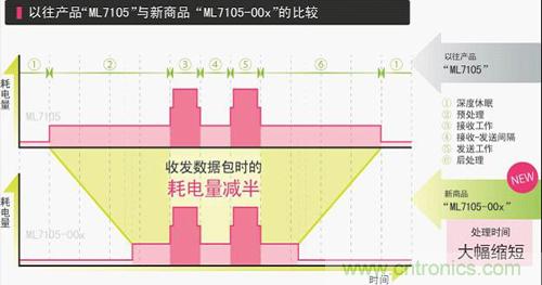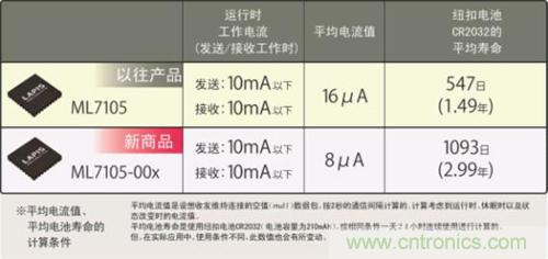 LAPIS Semiconductor去年推出的“ML7105”,實現了業(yè)界頂級的低耗電量(收發(fā)數據包時的運行狀態(tài))。此次開發(fā)出的新品“ML7105-00x”,不僅保持了運行狀態(tài)下的低耗電量性能,而且平均電流還減少了一半。所謂平均電流,是指按一定間隔反復收發(fā)數據包時的運行狀態(tài)(耗電量大)與休眠狀態(tài)(耗電量小)的平均電流值。通過大幅減少改變狀態(tài)所需的時間,使平均電流減半,從而使電池壽命可達2倍。因此,按LAPIS Semiconductor的工況條件,支持Bluetooth® Low Energy的、使用紐扣電池(CR2032)的設備其電池壽命即使在24小時連續(xù)工作的條件下,也可充分使用2年。