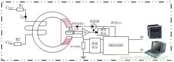 閉環式霍爾電流變送器是在直測式霍爾電流傳感器的基礎上發展起來的,主要由原邊電路、聚磁環、霍爾器件、次級線圈和放大電路、采樣電路、調零電路以及隔離變送模塊組成,如圖1。主回路電流IP 在聚磁環所產生的磁場,通過一個次級線圈的電流產生的磁場進行補償,使霍爾器件始終處于檢測零磁通的工作狀態。流經次級線圈的電流Is經過精密電阻RL進行采樣,為了減小恒流源的負載能力,此精密電阻RL的阻值較小。精密電阻將電流信號變換成mV的電壓信號,此信號經過濾波器的濾波作用后直接接入金升陽TM系列信號調理模塊進行信號隔離放大變換,變換換成工業需要的標準信號,如4-20mA、0-20mA、 l-5V、0-5V等標準直流信號,供給智能儀表顯示或者直接供給現場PLC或DCS系統使用。如果原邊電流Ip發生變化,則Ip產生的磁通發生變化,則在霍爾元件的兩表面產生電勢差,此電勢差經過運放的放大作用,直接控制Is補償電流的大小,此補償電流恰好與被測電流的方向相反,從而補償了原來的磁場,使得霍爾器件處于零磁通的狀態中。所以Is的電流可以真實地反映出原邊Ip的電流的變化,反應速度快。
