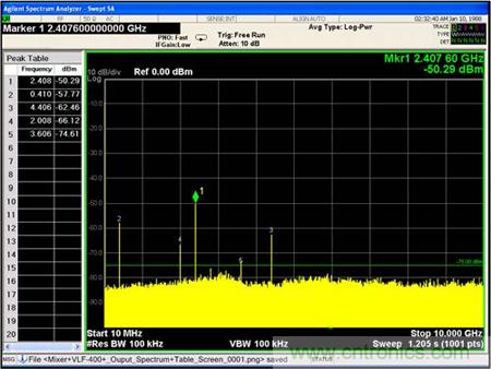依照圖3所示測試電路,將測試3種不同狀態下從濾波器反射到混頻器輸出的信號頻譜: