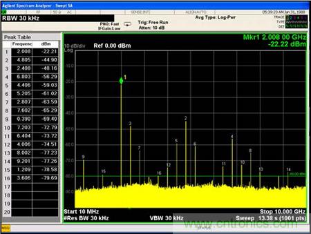 測試1:單輸入信號的中頻信號輸出頻譜測試