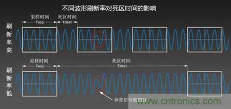 由此可知,死區時間的大小將影響捕獲周期的長短進而影響波形刷新率的高低。如下圖所示: