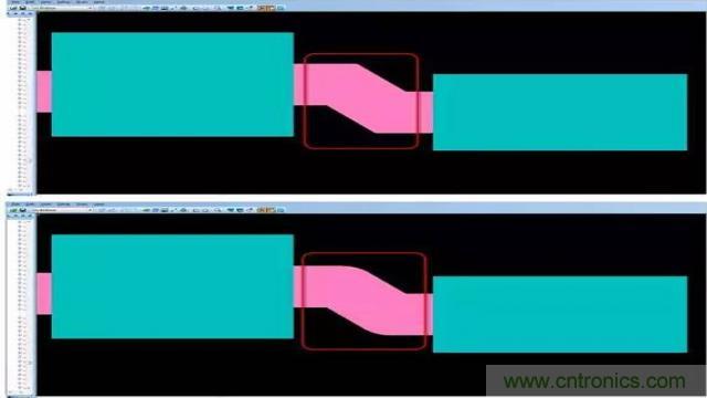 圖2:有效的PCB 設計工具會自動考慮用于繪制形狀的線型,以計算準確的線條寬度,幫助您輕松創(chuàng)建尖拐角。