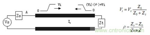 如下圖所示當(dāng)輸入波形遇到端接Zt,信號(hào)的一部分Viρ被反射回源端并且加在輸入波形上,整個(gè)輸入信號(hào)波形幅度為Viρ+Vi。反射的部分可能從源產(chǎn)生另一個(gè)反射,反射和逆反射一直持續(xù)直到傳輸線穩(wěn)定。