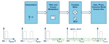 經過混頻器、調制器或解調器—這些都是混頻單元—處理后,射頻信號移動到DC至300 MHz以下的較低頻率。從數據轉換器到混頻器的處理模塊包括轉換器(ADC或DAC)、模擬濾波器和中頻放大器。我們可以把該級稱為模擬中頻級。