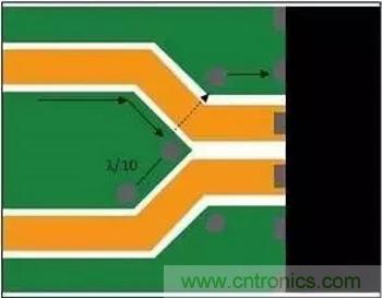 時鐘分布或合成器設備路由出來、用于承載相同頻率的跡線集群可能相鄰而行,因為干擾源音調已經存在于接收器線路上。不過,分組的線路最終會分散。分散時,應在分散線路之間提供接地灌流,并在其開始分散的地方灌入通孔,以便感應回流沿著額定回流路徑流回。在圖3中,接地島末端的通孔可使感應電流流到參考層上。接地灌流上其它通孔之間的間隔不要超過一個波長的十分之一,以確保接地不會成為共振結構。