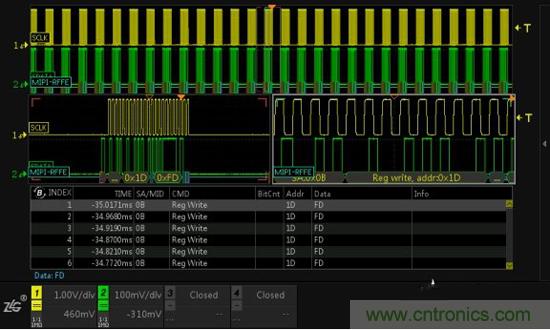 圖3為RFFE的通信例程,使用ZDS4054分析總線非常簡單,將示波器探頭分別接在SCLK和SDATA線上,將總線通信數據采集回來,然后開啟MIPI-RFFE協議解碼,簡單設置參數后,即可完成協議分析。