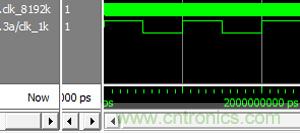 根據所需的時鐘頻率為1kHz的時鐘,而晶振時鐘的頻率為8192kHz,晶振時鐘與所需的時鐘頻率恰巧是8192倍的整數倍關系,因此需要對8192kHz的晶振時鐘進行8192分頻來獲得所需要的時鐘。根據整數倍分頻器的設計方法原理,通過ISE9.1邏輯設計工具,利用VHDL硬件描述語言來進行8192分頻的分頻器設計。然而8192又是偶數,所以需要設計的是偶數分頻器。對設計的內容通過Modelsim6.5仿真軟件進行仿真驗證,結果如圖3-4所示。