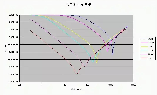 給出了不同容值下的典型S11參數(shù),從這些曲線可以清楚地看到SRF,還可以看出電容越大,在較低頻率處所提供的去耦性能越好(所呈現(xiàn)的阻抗越低)。