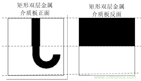四分之一波長單極子天線要求延伸出的輻射電長度為四分之一波長,其輻射場分為近場與遠場,近場是比較復雜的電磁耦合轉換環境。本節所設計的類單極子C形缺地探針長度也為四分之一波長,利用近場的磁生電的原理進行信號探測。其結構圖如下圖1所示,主體由微帶50ohm饋線和C形缺地線組成: