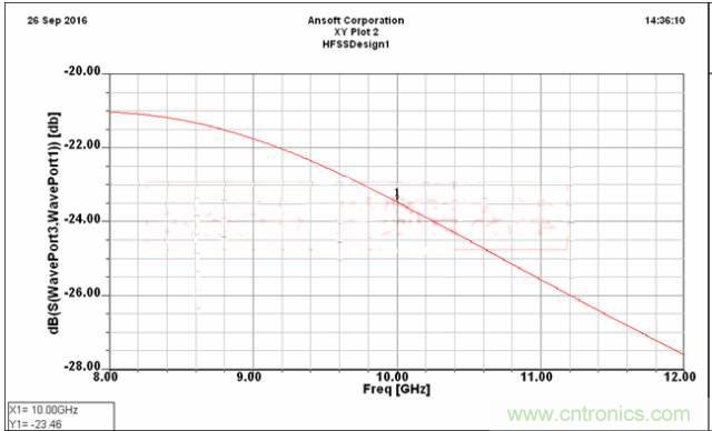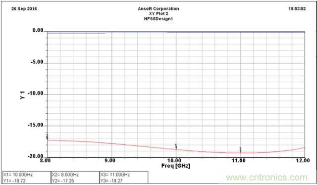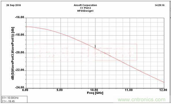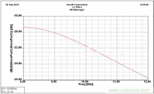 添加的C形環受到相同的磁場耦合,產生與主線相反的電流,從而對主線進行二次耦合,增強了主線的耦合度。仿真了1mm耦合間距的耦合度,仿真結果如下圖4所示。在10GHz耦合-18.72dB,x波段耦合度-17.25~-19.27dB,波動2dB左右。