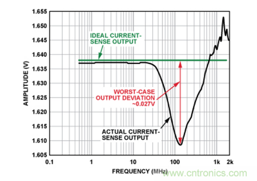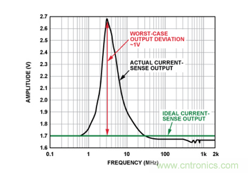 圖2所示為輸入在較寬頻率范圍內變化時電流傳感器的直流輸出與其理想值的偏差情況。從圖中可以看出,在1 MHz至20 MHz的頻率范圍內,偏差最為顯著(>0.1 V),且3 MHz時直流誤差達到最大值(1 V),這在放大器0 V至5 V的輸出電壓范圍中占據很大比例。