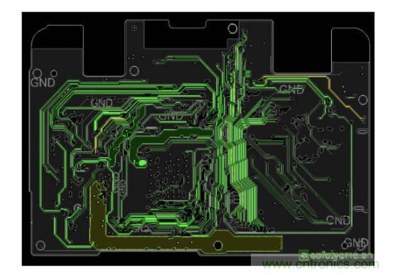 接下來針對2.2GHz頻點處輻射雜散的裕量不足,可先用N9311X 套件中的低靈敏度磁場環(huán)形探針以及來掃描及點測手機的近場雜訊,如圖6所示發(fā)現(xiàn)該頻率以及750MHz的信號最強近場輻射區(qū)域集中在PCB的下半部分其中一個電源網(wǎng)絡,此電源網(wǎng)絡會經(jīng)過較多高頻成分的芯片以及雜訊較多的LED以及按鍵區(qū)域。