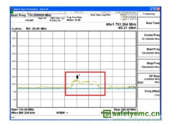 經(jīng)過查閱電源和芯片文檔得知其開關頻率的大約為1.9M,該頻率成分的電源噪聲會在調制過程中頻移到信號頻率兩側。然而由于使用較低靈敏度的探頭智能確定處板上下半部分都是可能的輻射雜散信號源,卻無法定位精確的位置。此時我們需要進一步使用套件中精度更高的磁場環(huán)形探頭或者垂直向磁場探頭來確定最強區(qū)域。最終發(fā)現(xiàn)在750MHz+/-17MHz在紅色框標示區(qū)域最強。測試結果請參考圖7所示,此處750MHz附近的近場輻射為-83.21dBm,2.25GHz處最大近場輻射為-44.18dBm。