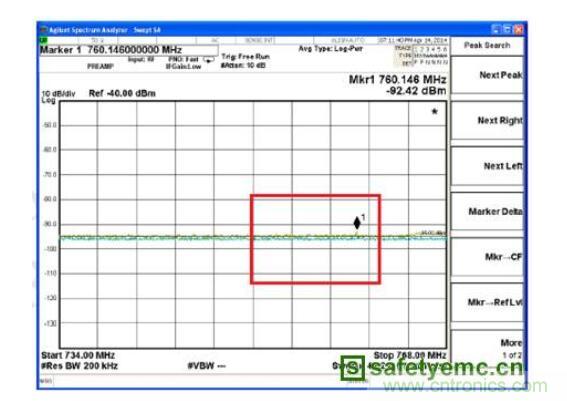 采用此濾波方案后的再進行近場掃描Max Hold的結果可參考圖9所示近場輻射結果,此處750MHz附近的近場輻射已經(jīng)下降到了-92.42dBm,2.25GHz處最大近場輻射下降到了-53.08dBm: