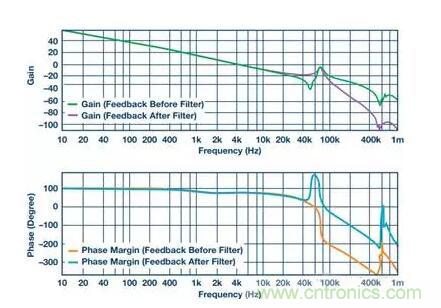 反饋在濾波器電感之前或之后獲取。人們沒有想到的是,哪怕濾波器不在反饋環路內部,開環波特圖依然存在非常大的變化。由于控制環路無論濾波器是否在反饋環路中都會受影響,因此也應對其進行適當補償。一般而言,這意味著將目標交越頻率向下調整至不超過濾波器諧振頻率(FRES)的五分之一到十分之一。